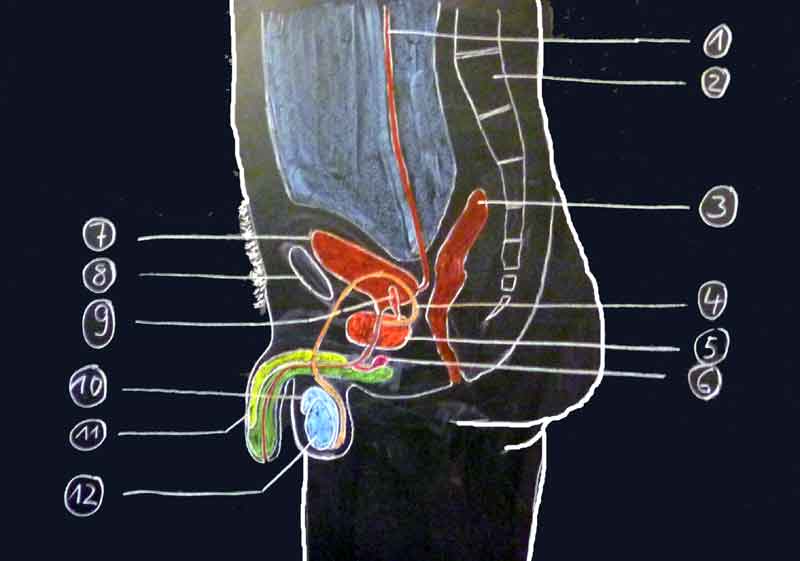 1 Harnleiter; 2 Wirbelsäule; 3 Enddarm; 4 Samenleiter; 5 Vorsteherdrüse (Prostata); 6 Schleimdrüse (Cowpersche Drüse); 7 Harnblase; 8 Beckenknochen (Schambein); 9 Bläschendrüse; 10 Nebenhoden; 11 Schwellkörper; 12 Hoden;