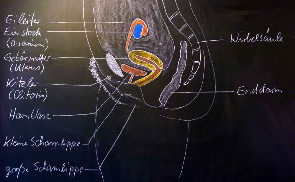 - Der unpaare Uterus ist ein dickwandiges, sehr muskulöses Hohlorgan von birnenförmiger Gestalt, das in der Bauchhöhle zwischen Blase und Mastdarm liegt. Von seinem unteren Abschnitt führt die röhrenförmige Scheide (Vagina) nach außen; durch sie verlässt das Kind bei der Geburt den mütterlichen Körper.