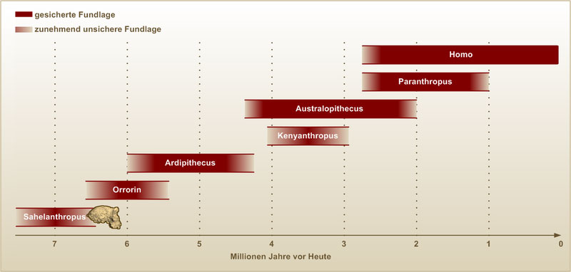 Die Gattungen der Hominini: Die zeitliche Abfolge lässt keine Rückschlüsse auf ihre verwandtschaftlichen Beziehungen zu. Quelle: Wikipedia: Stammesgeschichte des Menschen
