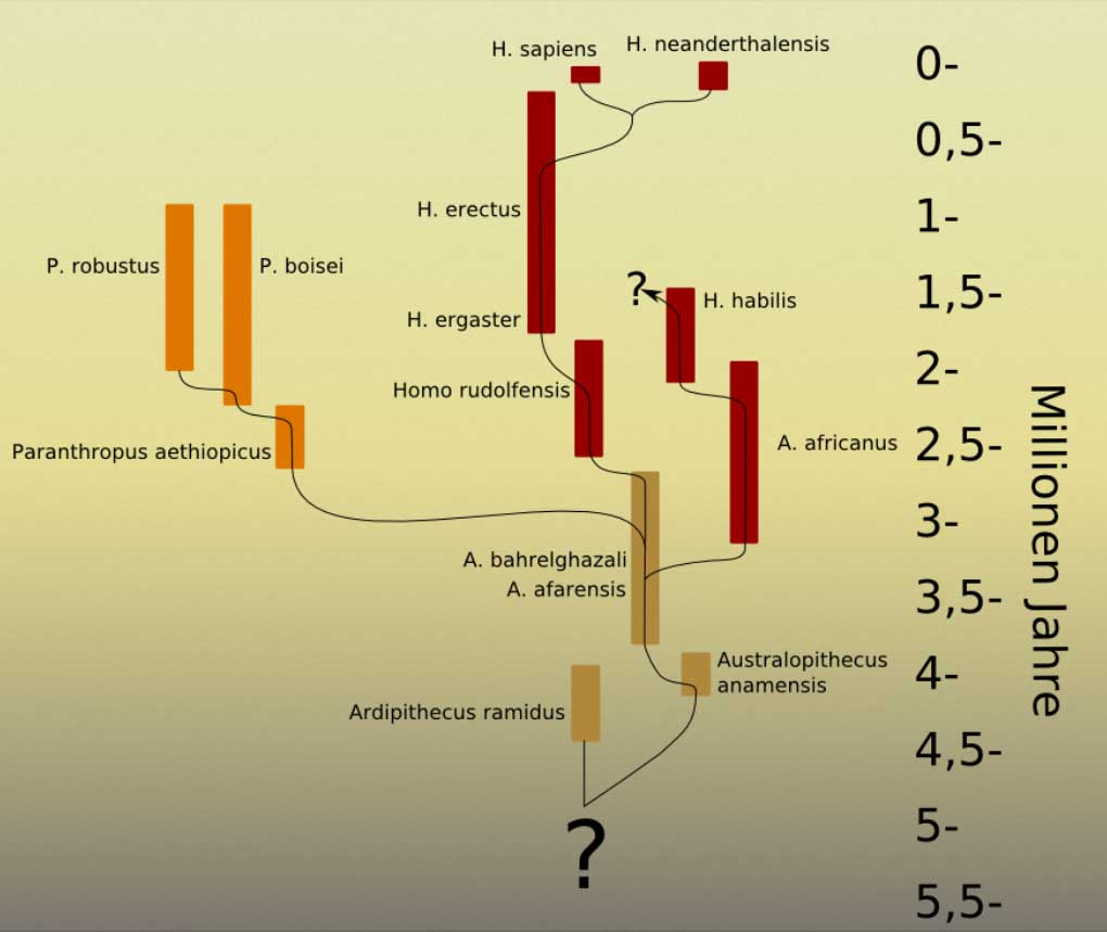 Hypothese zur Evolution der Menschen, wie sie aufgrund der gegenwärtigen Fundlage beispielsweise durch Friedemann Schrenk vertreten wird. Quelle: Wikipedia: Stammesgeschichte des Menschen