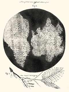 - 1665: Robert Hooke prägte den Begriff Zelle (cellula, Kämmerchen), nachdem er diese im Gewebe des Flaschenkorks, später dann des Farns und Sonnentaus, mit Hilfe eines der ersten Mikroskope entdeckte und detailliert aufzeichnete (siehe Abbildung).